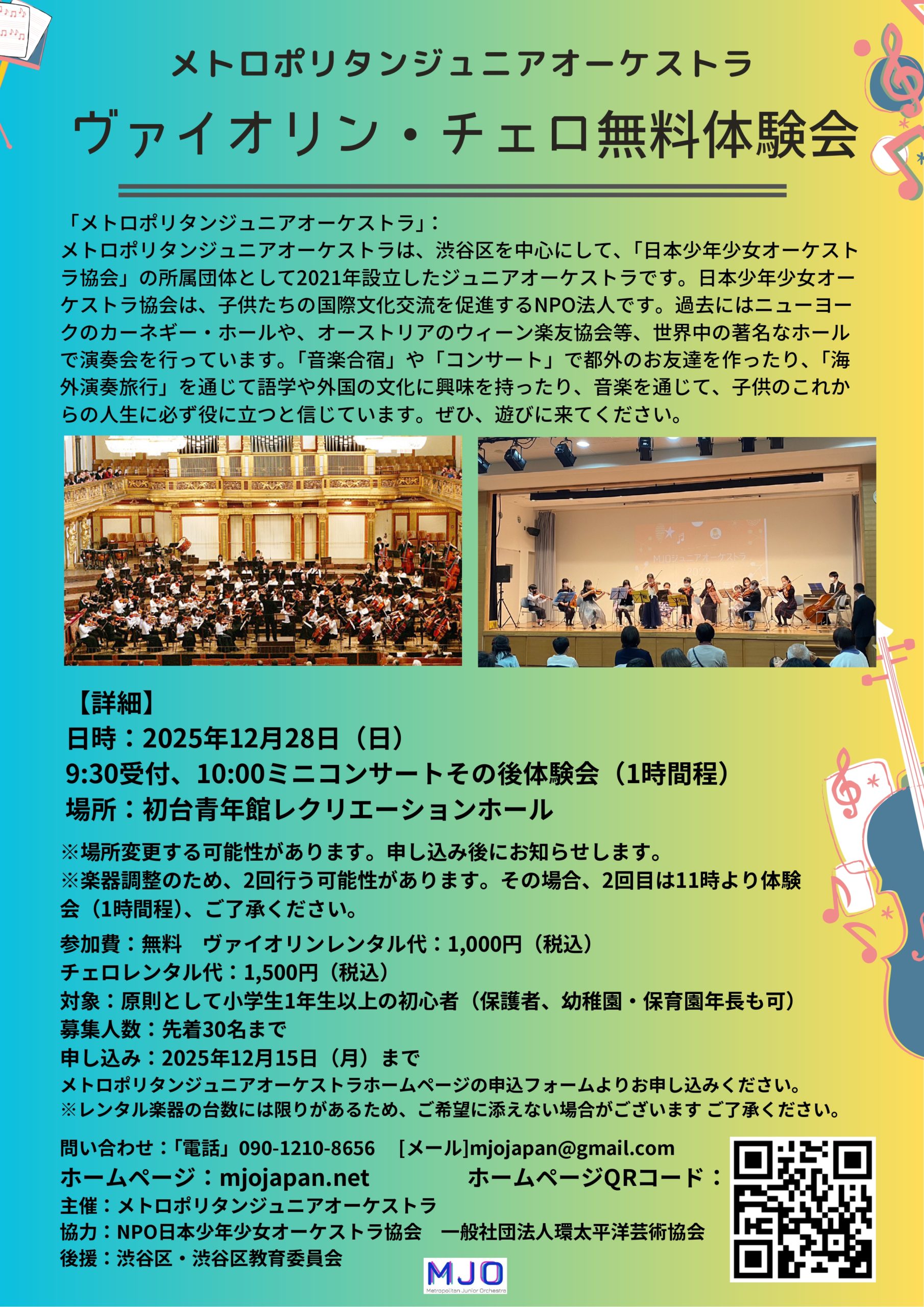 11/9、新宿文化センターで行われたイベントへ、新宿国際ジュニアオーケストラのサポートで出演しました。 mjoのメンバーと音楽総監督の南紳一先生。 新宿国際ジュニアオーケストラのほか、メトロポリタンジュニアオーケストラ、 […]